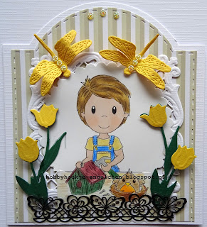 Vandaag heb ik eens een kaartje waar een jongetje op staat... meestal zijn het meisjes dus vond het dit keer wel leuk om eens een jongetje uit te zoeken. De kaart is voor de challenge bij dreamvalley waar het thema voorjaarskleurtjes is.